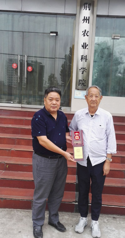 9月17日下午,荆州农业科学院院长陈洪洲代表荆州市人社局为我院离休干部付恒谦同志,全国劳模周鑫同志颁发庆祝中华人民共和国成立七十周年纪念章。